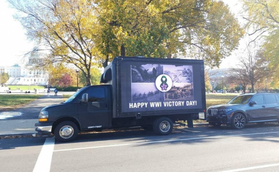 Na kamionu su se, međutim, pored srpskih i američkih zastava, te čestitiki povodom Dana primirja, tj. kako navode, Dana pobede, našle i slike koje su na Kapitolu skrenule pažnju na stradanje srpskog naroda na Kosovu.