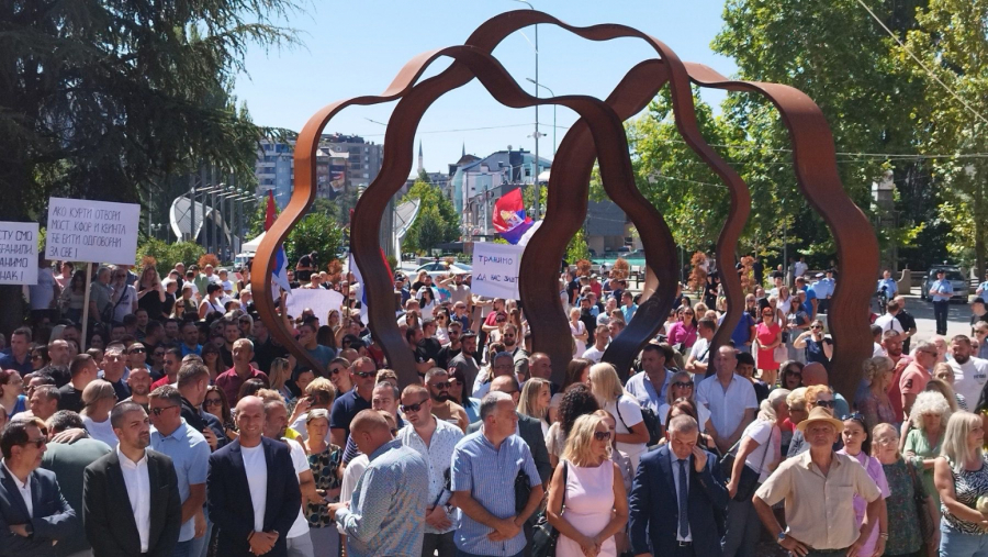 Okupljeni nose transparente "Na mostu smo opstanak branili, sad branimo nestanak", "Ako Kurti otvori most, Kfor i Kvinta će biti odgovorni", "Dok EU i SAD pišu saopštenja, nas proteruju", " Kurti, nisi nas sve proterao, ima nas još dosta", "Tražimo da nas Kfor zaštiti", "Ako Kurti otvori most, Kfor i Kvinta će biti odgovorni za sve", "Dok EU i SAD pišu saopštenja, nas proteruju", "Upozorili smo vas", "Kurti, ne gasi srpske institucije, nego formiraj ZSO", "Kfor ima 1244 razloga da ne otvori most", "Nećemo se odseliti odavde ni po koju cenu", i "Bahtiri, prebroj nas ako možeš".