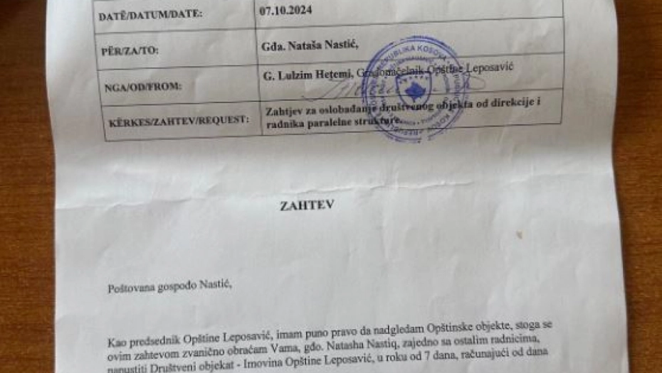 "Poštovana gospođo Nastić, kao predsednik Opštine Leposavić, imam puno pravo da nadgledam opštinske objekte, stoga se ovim zahtevom zvanično obraćam Vama, gospođo Nataša Nastić, da zajedno sa ostalim radnicima napustite društveni objekat imovine opštine Leposavić, u roku od sedam dana, računajući od dana ovog zahteva", stoji u zahtevu koji je Hetemi uručio.