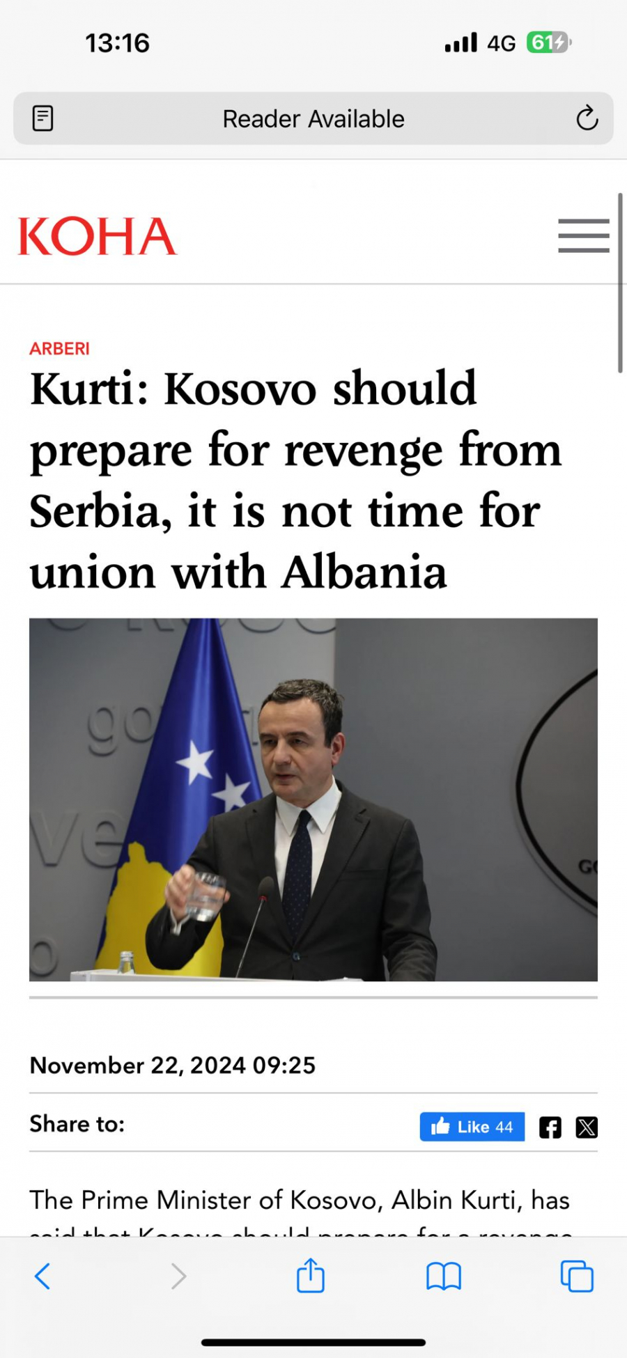 Kurti kojеm jе tzv. "Vеlika Albanija", osovina njеgovе idеologijе i srž političkog programa njеgovе partijе zakukao je za albanske medije, a švajcarski list NNZ je to preneo, pozivajući se na Kurtijeve izjave tokom diskusije koju je organizovalo Švajcarsko društvo za spoljnu politiku.