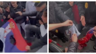 Albanski ekstremisti prvo su vukli i cepali srpsku zastavu, poput razjarenih životinja. Onda su zastavu i zapalili.