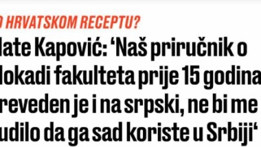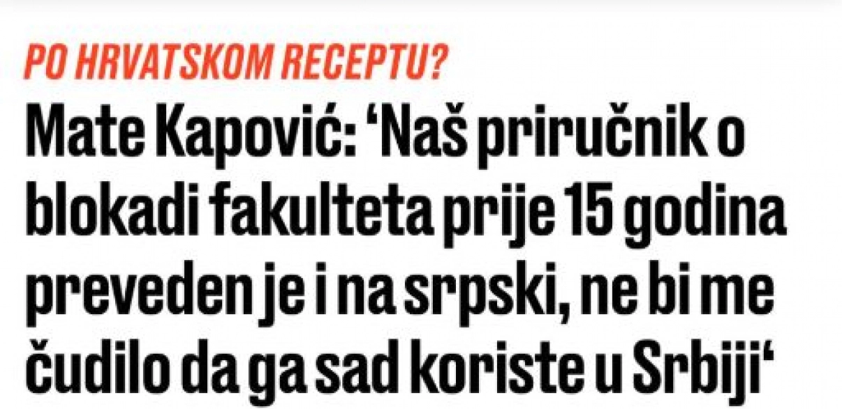 Na Jutarnjem listu osvanuo je tekst pod naslovom "Mate Kapović: Naš priručnik o blokadi fakulteta pre 15 godina preveden je i na srpski, ne bi me čudilo da ga sad koriste u Srbiji". Uz tekst objavlen je i minikomentar pored fotografije "Po hrvatskom receptu?"