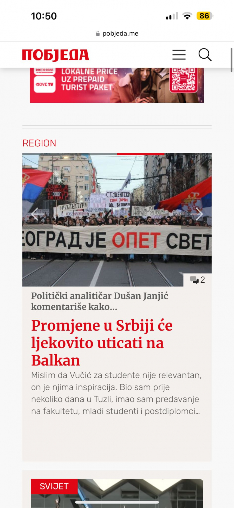 Naime, on je u glasilu Mila Đukanovića pisao o protestima i jezivoj kampanji koja se sprovodi u Srbiji, gde dolaze ''hrvatski studenti'' da prošetaju ETF-om ''turistički'', a sve u pokušaju destabilizacije.