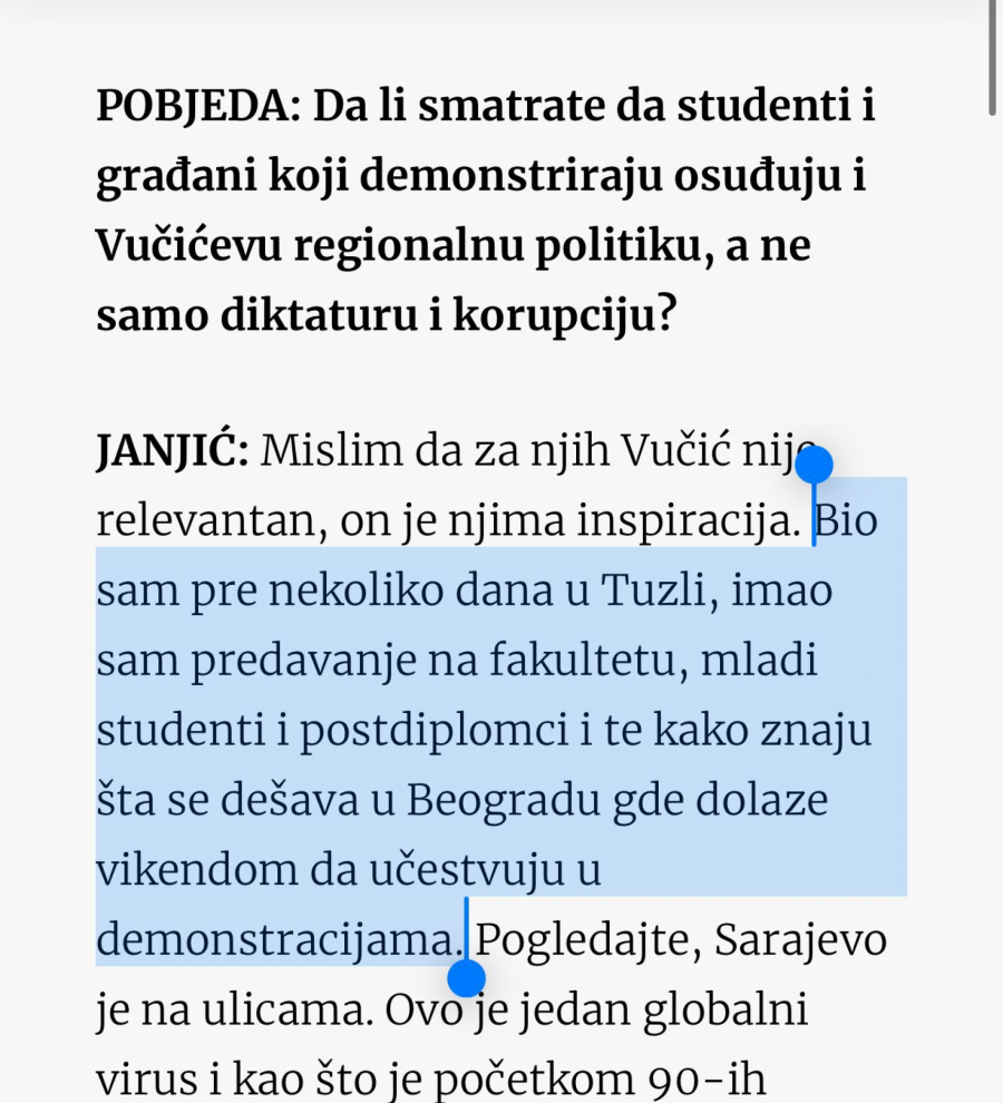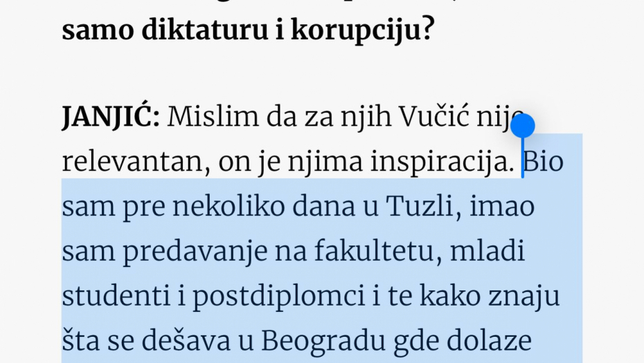 - Bio sam pre nekoliko dana u Tuzli, imao sam predavanje na fakultetu, mladi studenti i postdiplomci i te kako znaju šta se dešava u Beogradu gde dolaze vikendom da učestvuju u demonstracijama, rekao je Janjić, čime je samo potvrdio kampanju i širenje mržnje, kao i to da studenti ovde nisu došli turistički, već sa razlogom - da pokušavaju da ruše tuđu zemlju.