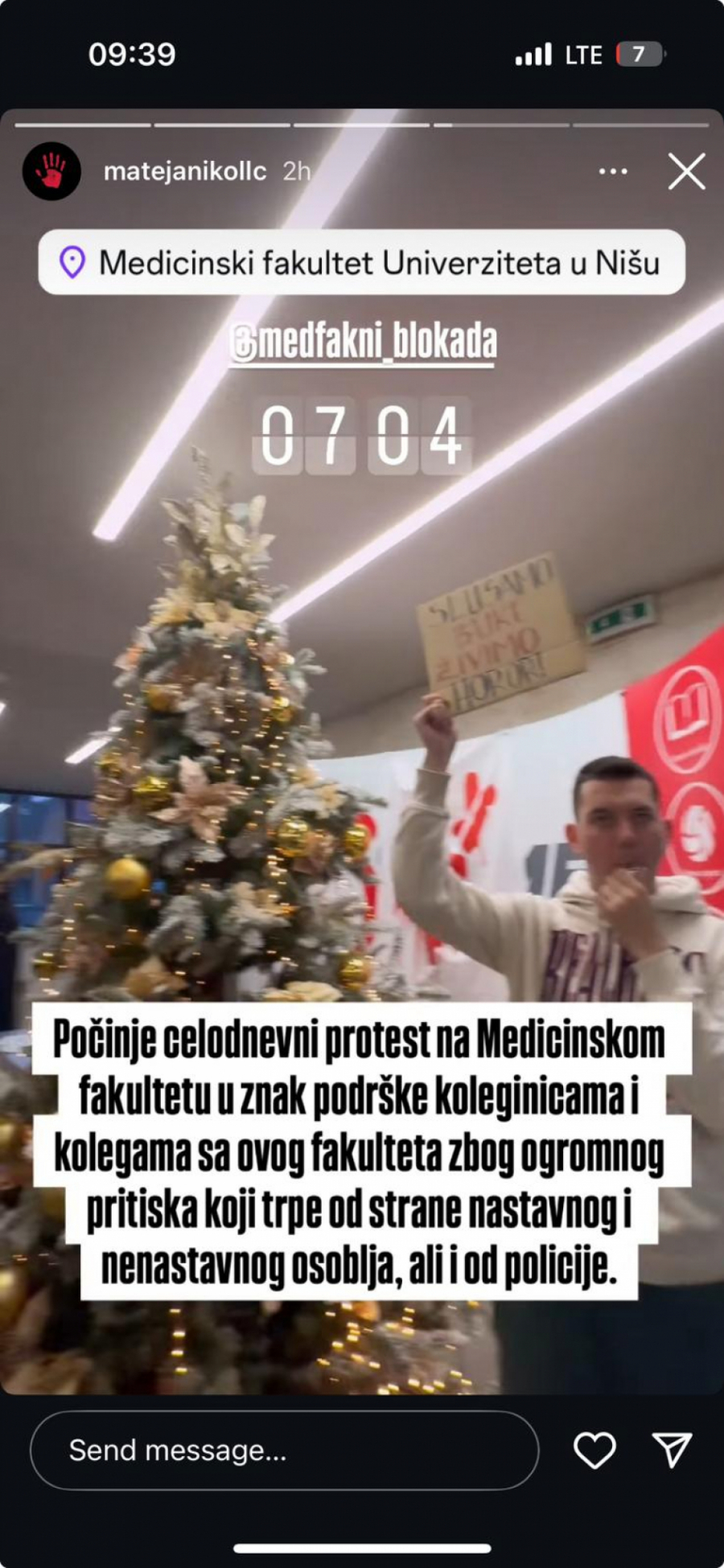 Na Medicinskom fakultetu u Nišu, danas su među studentima Medicinskog fakulteta koji su u blokadi, tu došli i student Elektronskog fakulteta u Nišu, Milan Topalović, član pokreta ”Borba“, student Pravnog fakulteta u Nišu Dimitrije Dimić i član omladine "PSG" i student Pravnog fakulteta u Nišu Mateja Nikolić.