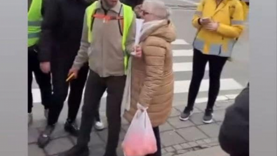 Nakon što su bespomoćnu ženu redari sklonili sa jednog na drugi kraj raskrsnice, Natalija Petrović (devojka sa naočarima koja nosi transparent) i koja je članica pokreta Kreni-Promeni je na najbezobzirniji način ženu gurnula, koja je nakon toga pala na beton.