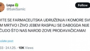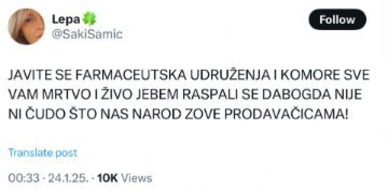 "Javite se farmaceutska udruženja i komore sve vam mrtvo i živo j***m raspali se dabogda. Nije ni čudoi što nas narod zove prodavačima", navela je jedna pristalica antisrpske opozicije na mrežama.