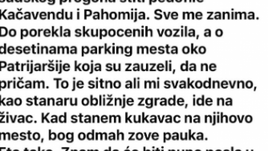 - Kada oslobodimo zemlju, ja se, kao bivši zamenik Verice Barać u Savetu za borbu korupcije, prijavljujem za komisiju koja će da češlja finansije Crkve. Moramo da vidimo zašto je ova moralna ustanova baš toliko posrnula u nemoral. Zašto je onaj koji treba da propagira apsolutne etičke vrednosti, tokom vladavine SNS-a, učinio sve suprotno i halapljivo rukopoložio milione u svoje mantije. Zanima me zašto ne plaćaju porez, otkud oni u poslu s nekretninama, otkud eparhijama pravo da prodaju manastirska imanja. I kome i pod kojim uslovima. Zanima me i moralno posrnuće čestitih propovednika jer je ono obično preduslov za greh. Dakle ko je i zašto odlikovao Dodika i Batu Santosa Gašića i ko zna kog još džeparoša naroda. Ko je taj koji od sudskog progona štiti pedofile Kačavendu i Pahomija. Sve me zanima. Do porekla skupocenih vozila, a o desetinama parking mesta oko Patrijaršije koja su zauzeli, da ne pričam. To je sitno, ali mi svakodnevno, kao stanaru obližnje zgrade, ide na živac. Kad stanem kukavac na njihovo mesto, Bog odmah zove pauka.