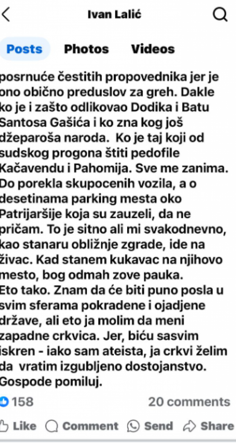 Eto tako. Znam da će biti puno posla u svim sferama pokradene i ojađene države, ali eto ja molim da meni zapadne crkvica. Jer, biću sasvim iskren - iako sam ateista, ja crkvi želim da vratim izgubljeno dostojanstvo. Gospode pomiluj - poručio je Lalić u svojojm, u najmanju ruku, uvredljivoj objavi na svom Facebook profilu.