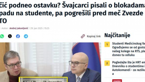 „Vučić podneo ostavku? Švajcarci pisali o blokadama i napadu na studente, pa pogrešili pred meč Zvezde“. Švajcarci, međutim, nisu pominjali nikakve blokade, Nova to dodaje da neslan do bljutavosti tekst dosoli. U kontekstu mogućih ispada Delija, list naime piše: