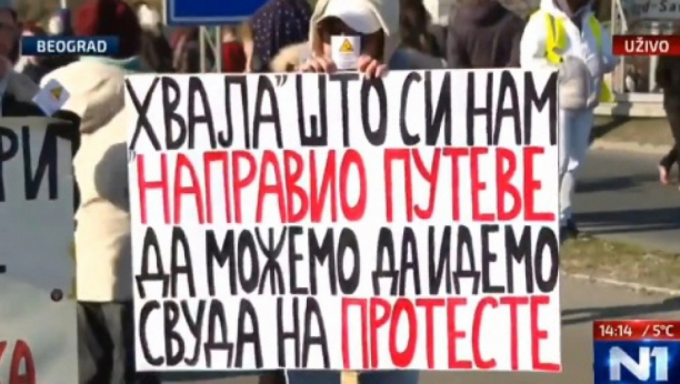 "Na jednoj paroli piše: "HVALA ŠTO SI NAM NAPRAVIO PUTEVE DA MOŽEMO DA IDEMO SVUDA NA PROTESTE!", eto, to su njihove poruke - malo pričaju ali mnogo kroz te transparente kažu!"