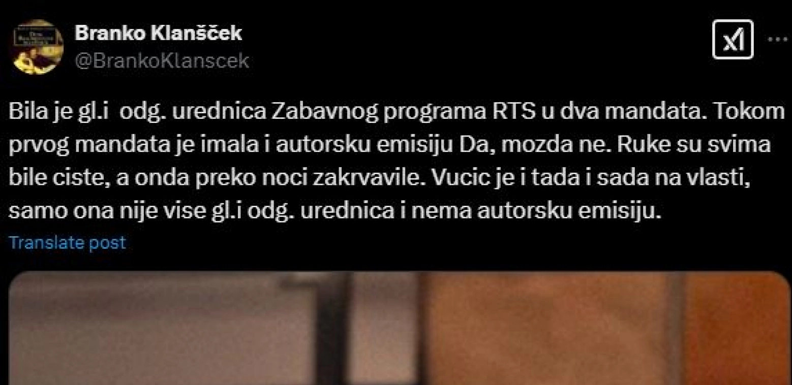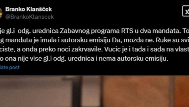 - Ruke su svima bile čiste, a onda preko noći zakrvavile. Vučić je i tada i sada na vlasti, samo ona nije više glavna i odgovorna urednica i nema autorsku emisiju - naveo je Klanšček.