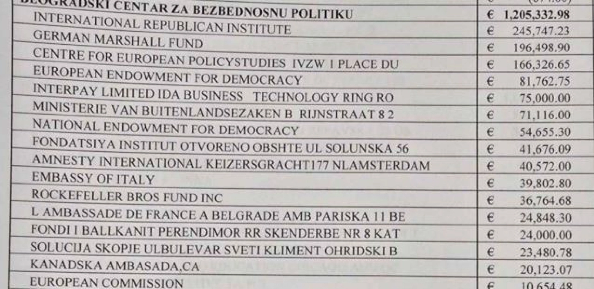 NVO Beogradski centar za bezbednosnu politiku (BCBP) - i da, oni nisu nevini posmatrači. Ova organizacija već godinu dana vuče velike donacije iz inostranstva, a među najpoznatijim donatorima su IRI, Marsal fond, EED, NED, pa čak i Rofkeleri.