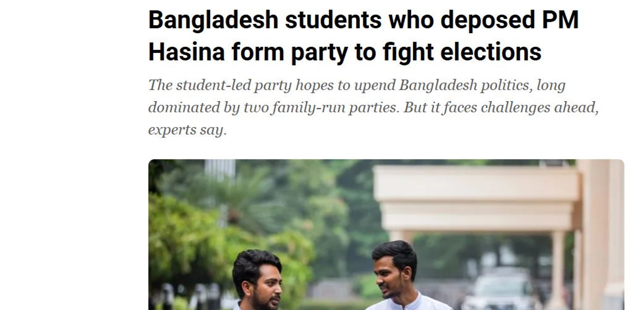 Islam – 26-godišnjak i zaštitno lice julske pobune, koja je srušila Hasinu, a kasnije i vršilac dužnosti šefa bangladeškog Ministarstva informisanja i radiodifuzije – predvodiće novu stranku. Islam je u utorak podneo ostavku na sastav privremene vlade, na čijem čelu je bio dobitnik Nobelove nagrade za mir Muhamed Junus, da bi preuzeo vođstvo nove stranke, koja će u početku imati centralni komitet od oko 150 članova.