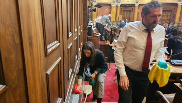 Haos štetu koju su divljaci iz opozicije napravili u skupštini Srbije čiste poslanici aktuelna vlast.