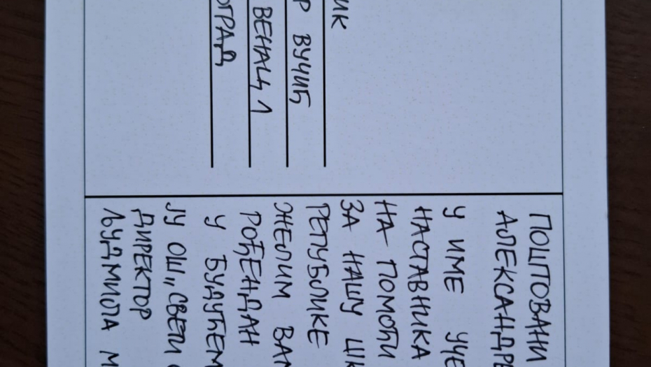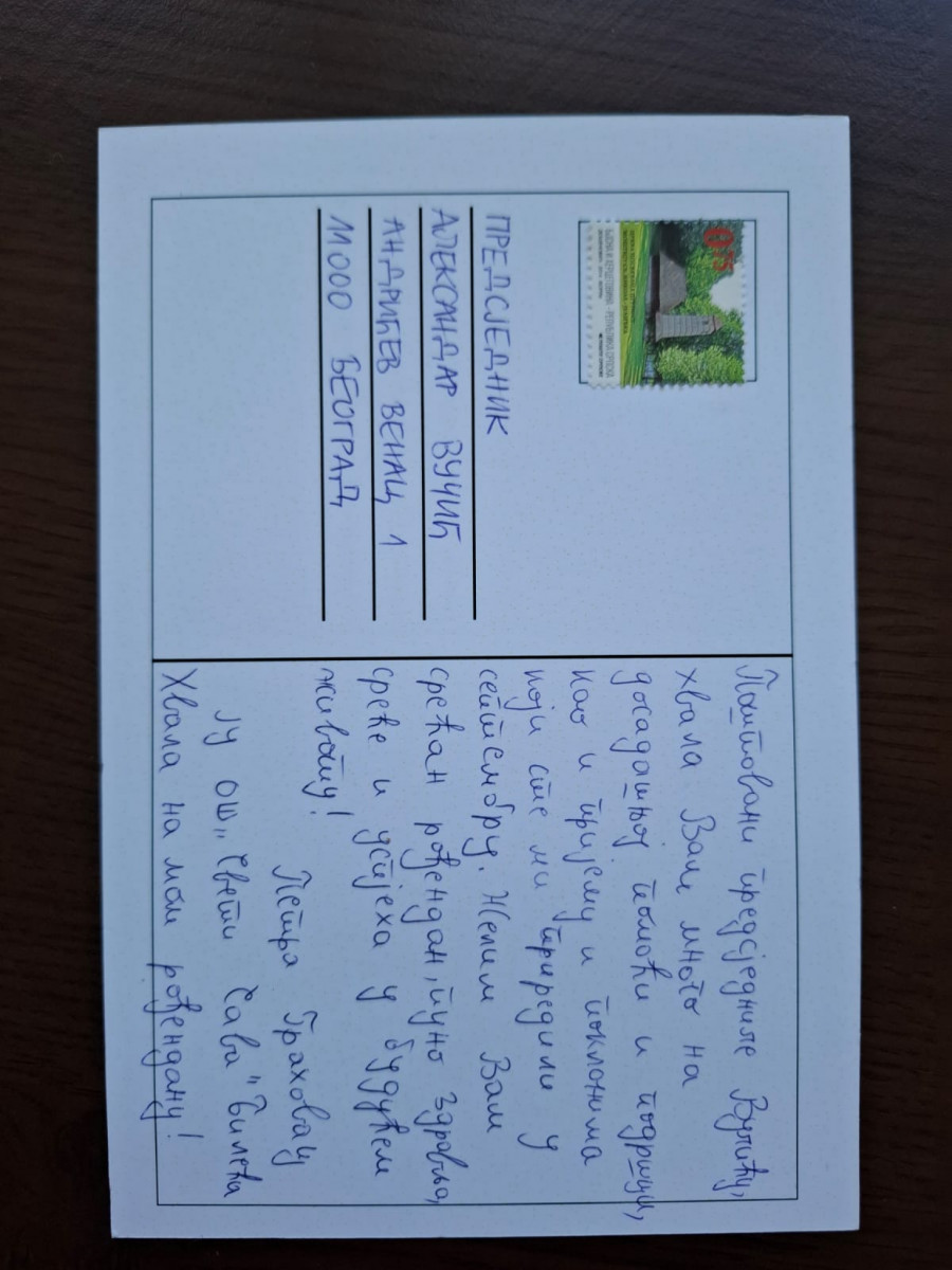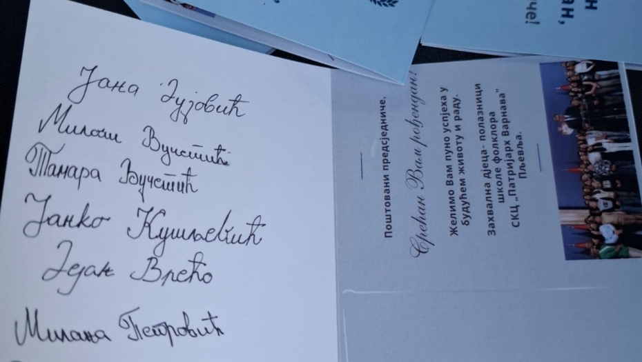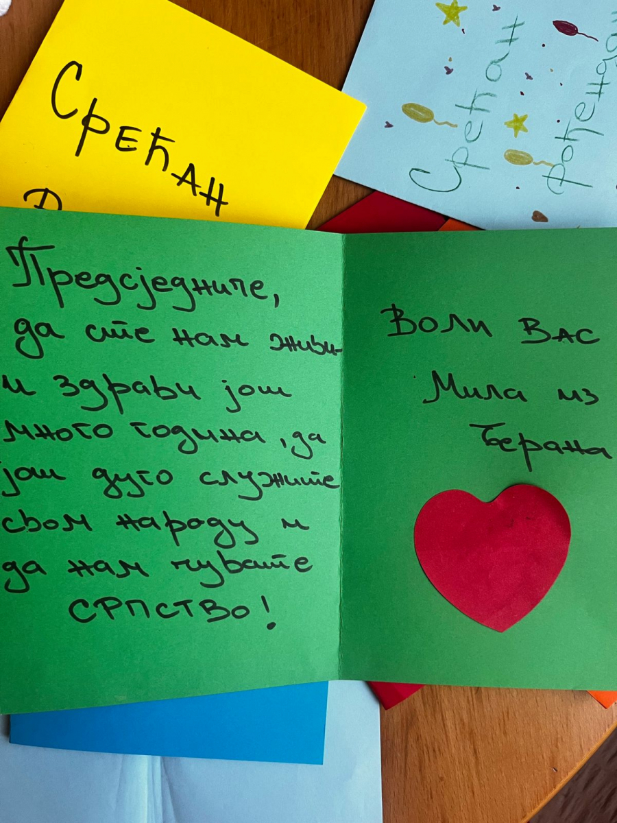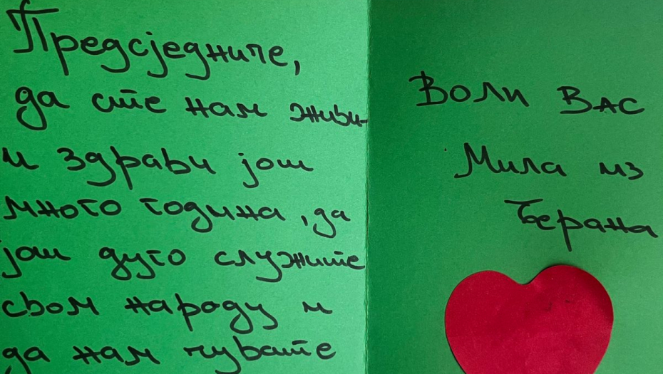 - Poštovani predsjedniče Vučiću, hvala Vam mnogo na dosadašnjoj pomoći i podršci, kao i prijemu i poklonima koje ste mi priredili u septembru. Želim Vam srećan rođendan, puno zdravlja, sreće i uspjeha u budućem životu - piše u čestitki dečaka iz Bileće.