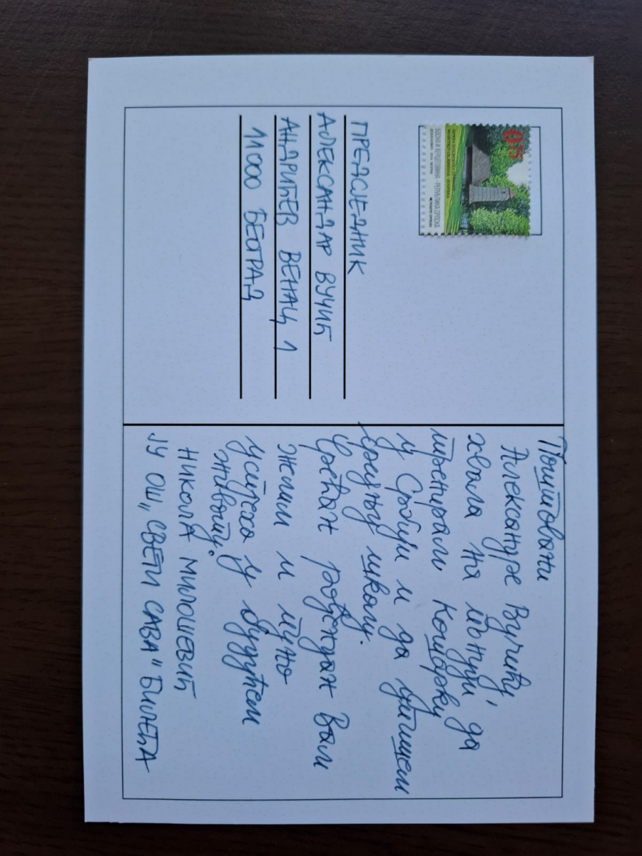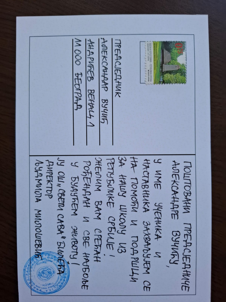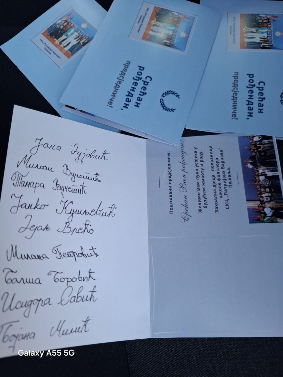 - Poštovani predsjedniče Vučiću, hvala Vam mnogo na dosadašnjoj pomoći i podršci, kao i prijemu i poklonima koje ste mi priredili u septembru. Želim Vam srećan rođendan, puno zdravlja, sreće i uspjeha u budućem životu - piše u čestitki dečaka iz Bileće.