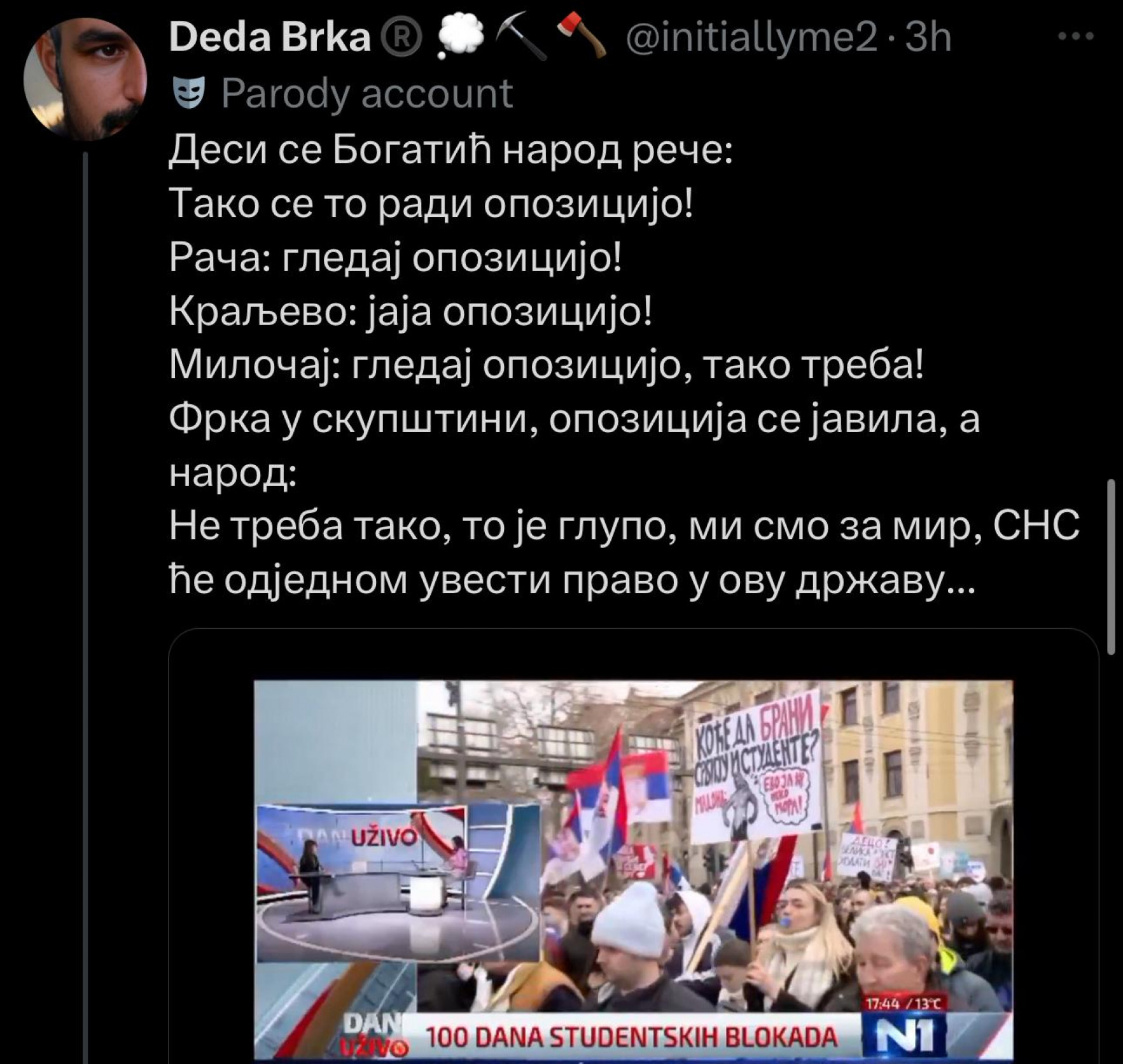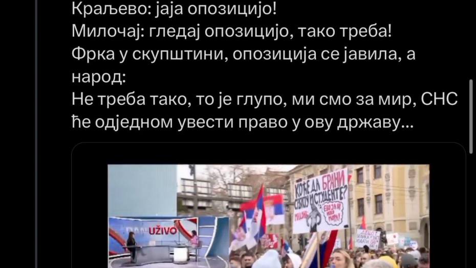 Kao što možemo videti u narednoj galeriji, profil na društvenoj mreži Iks koji ima podršku potpredsednice Stranke slobode i pravde (SSP) Marinike Tepić obrušio se na studente koji ne žele da imaju ništa sa nasiljem opozicije u Skupštini.