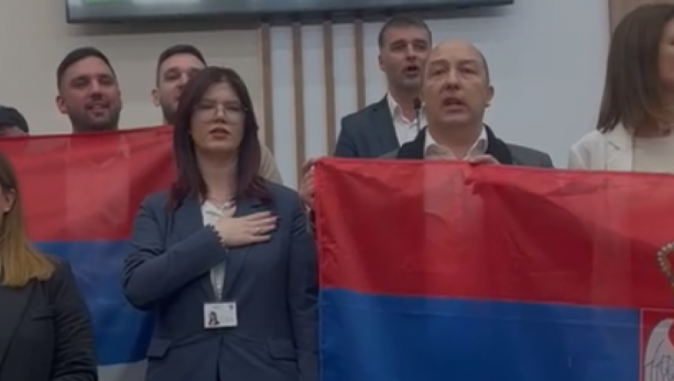 Odbornici dela opozicije su od početka sednice sa zvučnika neprekidno puštali himnu "Bože pravde', stajali i držali razvijene zastave Srbije.