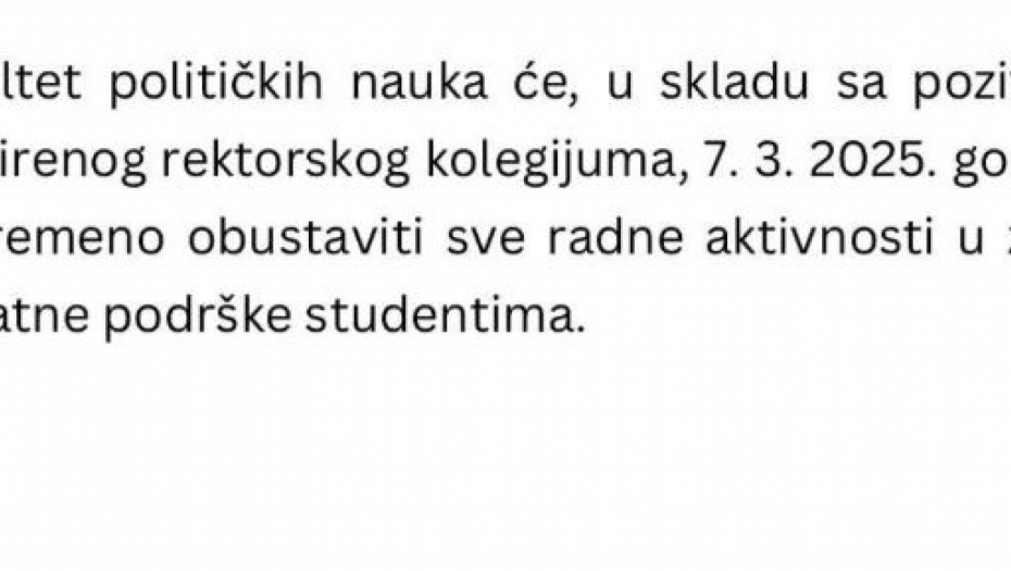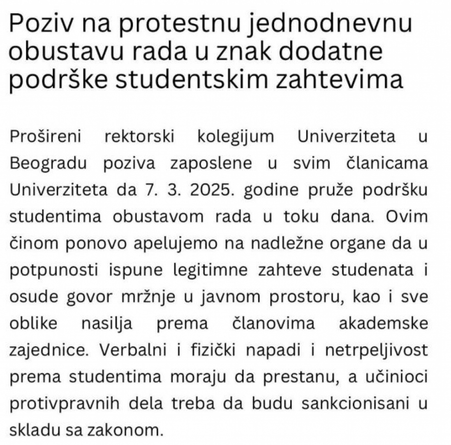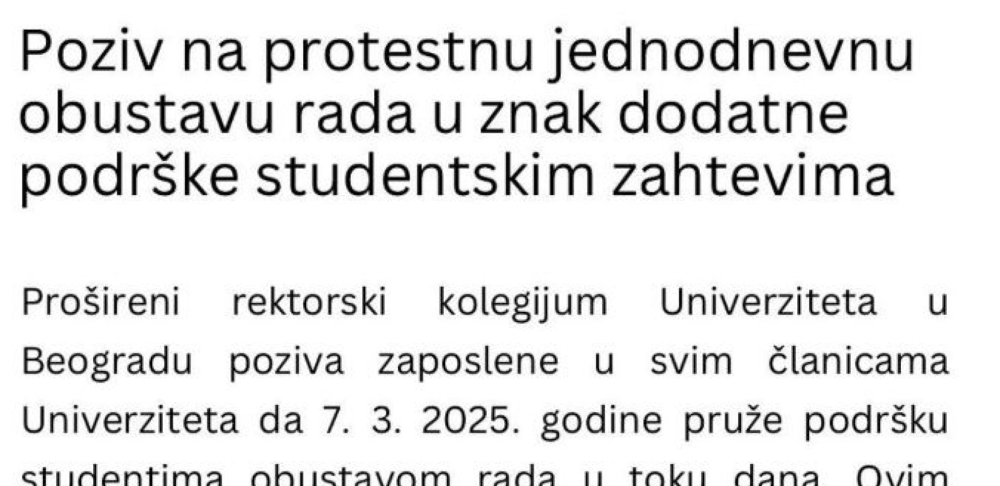 Prošireni rektorski kolegijum uputio je poziv na protestnu jednodnevnu obustavu rada u znak dodatne podrške studentskim zahtevima.
