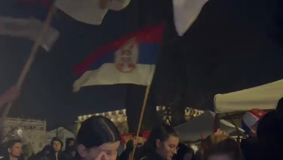 Kako možemo videti na snimku, okupljeni studenti koji žele da uče nose srpske trobojke i u glas pevaju himnu "Bože pravde"