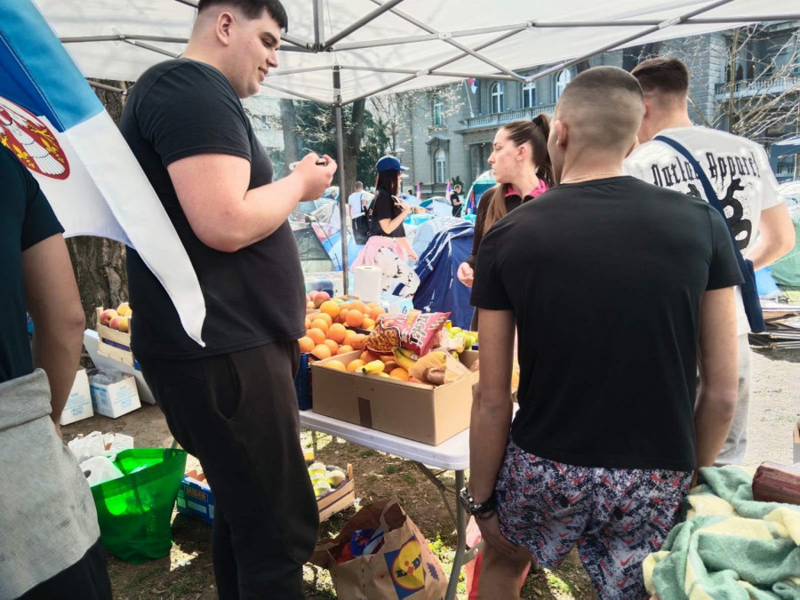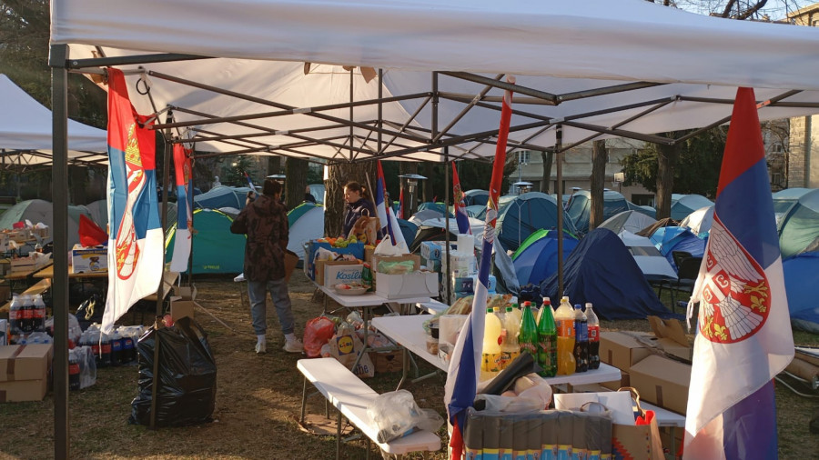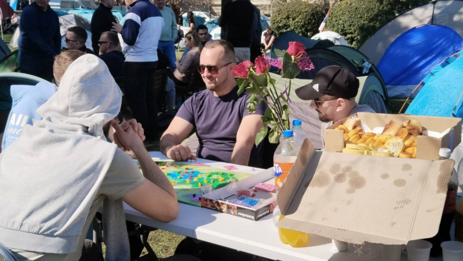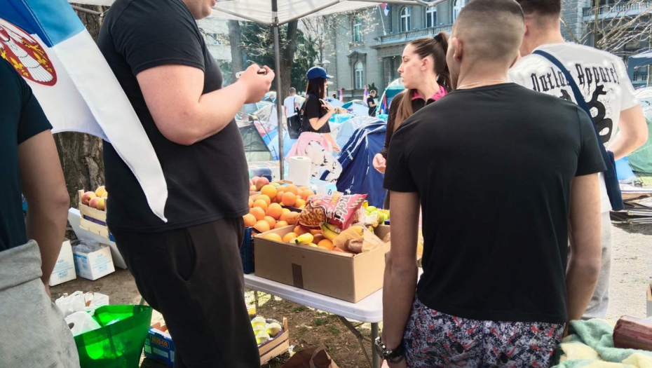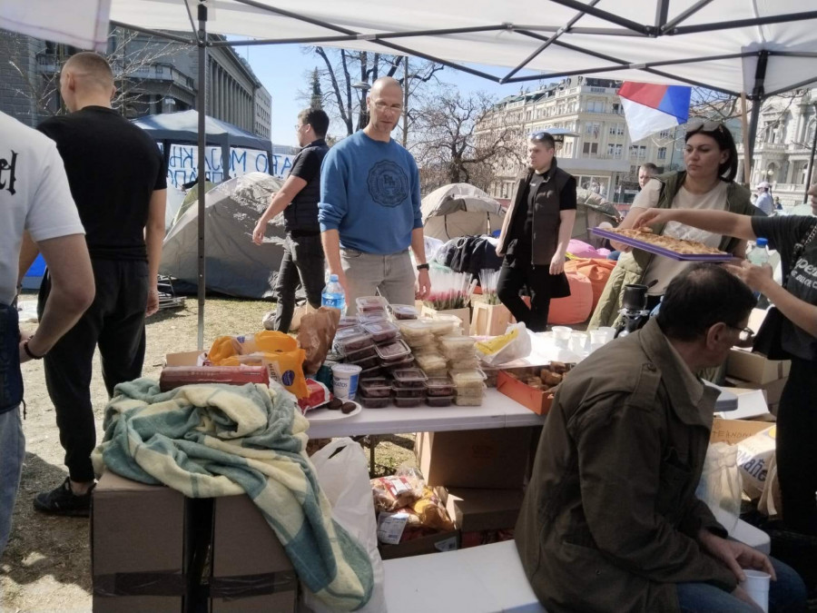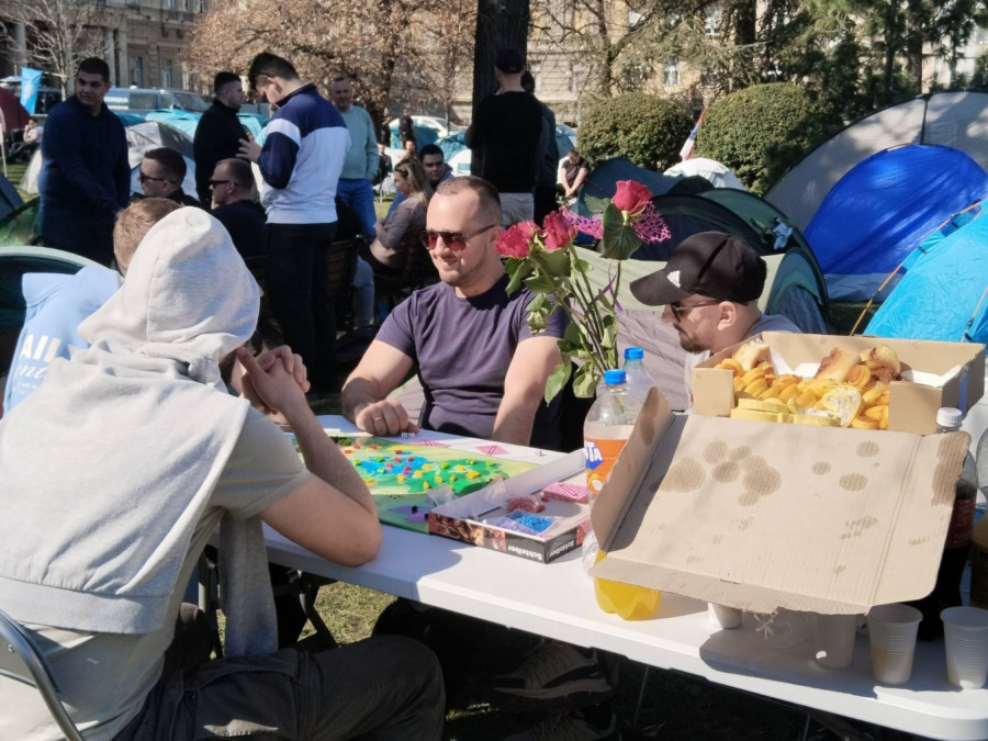 - Evo nas u kampu, veselo je, igraju se društvene igre, malo smo počeli da puštamo i muziku, da kažem atmosfera je dobra. Nije više ni hladno, tu su i ćebići, organizovane su i neke grejalice, ljudi nam donose non-stop neke stvari, sve u svemu jedna dobra atmosfera. Ueli smo i malo predaha od ovih što nas provociraju tokom celog dana, slobodno nam se pridružite, sigurno ćemo ovo izgurati do kraja i hvala svima koji nam pomažu.