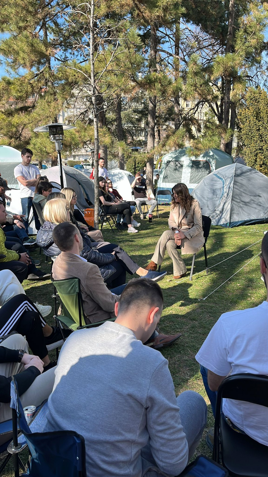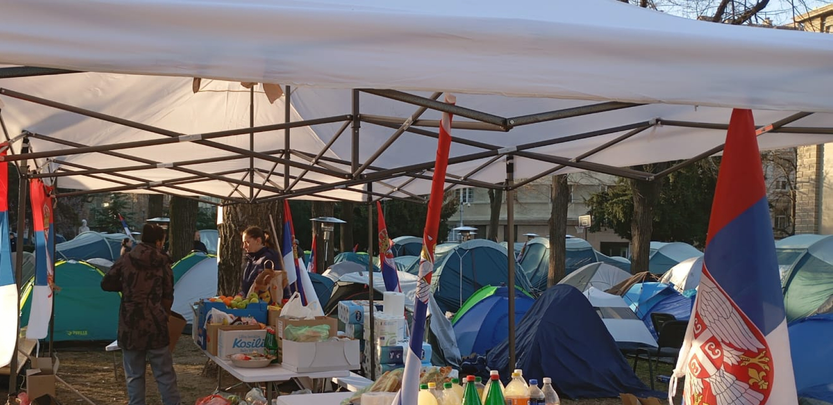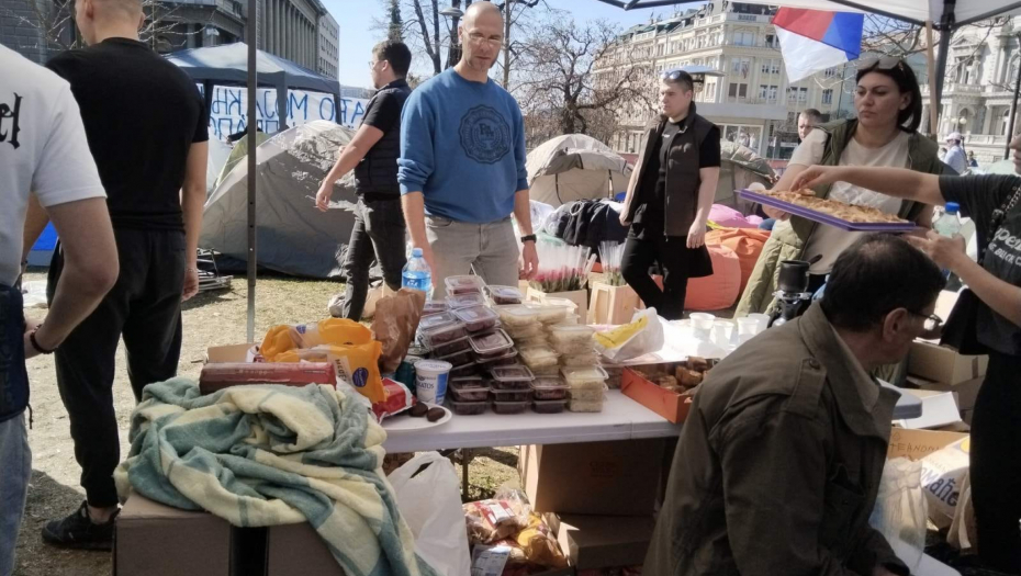 - Evo nas u kampu, veselo je, igraju se društvene igre, malo smo počeli da puštamo i muziku, da kažem atmosfera je dobra. Nije više ni hladno, tu su i ćebići, organizovane su i neke grejalice, ljudi nam donose non-stop neke stvari, sve u svemu jedna dobra atmosfera. Ueli smo i malo predaha od ovih što nas provociraju tokom celog dana, slobodno nam se pridružite, sigurno ćemo ovo izgurati do kraja i hvala svima koji nam pomažu.