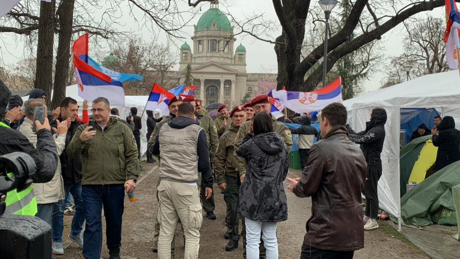 - Želeo bih da se osvrnem na događaje od sinoć, da kažem da studenti koji žele da uče osuđuju svaki vid nasilja. Sinoć smo imali takve scene, blokaderi su pravili protest, blokadu oko zgrade RTS, nakon toga su počeli da dolaze sa svake strane Pionirskog parka, vređali su, pretili, grupica po 10, 20, 30, mnogo je provocirala. Došlo je i do fizičkih incidenata, student blokader nasilnik je preskočio ogradu i izazvao manji fizički incident. Na sreću, brzim ragovanjem, sprečili smo veće incidente. Trajalo je to do četiri sata ujutru. Nisu hteli da nam daju da spavamo, hteli su da nas izmore. Ove noći je to podignuto na veći nivo, blokaderi su dolazili oko ograde, da nas vređaju, da nam prete da ćemo 15. da se obračunamo, nema šta da nam rade 15. Ovo je veoma strašno i želimo da osudimo nasilje, mi smo za demokratiju.