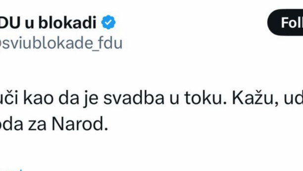 - Grad zvuči kao da je svadba u toku. Kažu, udaje se Sloboda za Narod - stoji u objavi FDU u blokadi na društvenoj mreži X.