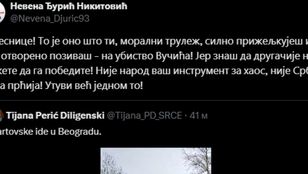 - Bolesnice! To je ono što ti, moralni trulež, silno priželjkuješ i na šta otvoreno pozivaš - na ubistvo Vučića! Jer znaš da drugačije ne možete da ga pobedite! Nije narod vaš instrument za haos, nije Srbija vaša prćija! Utuvi već jednom to! - poručila je Nevena Đurić Nikitović.