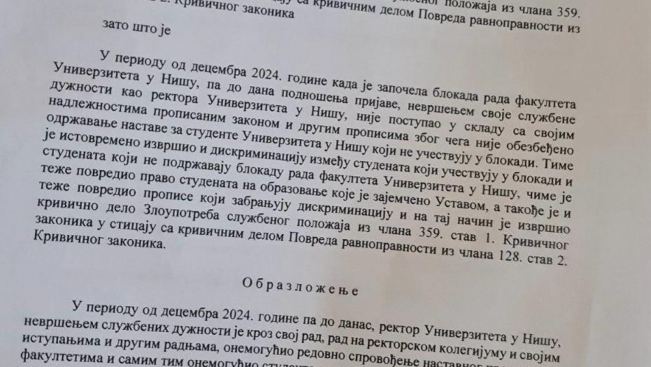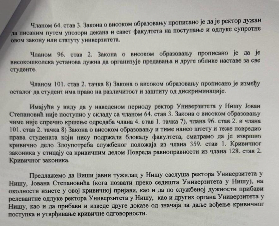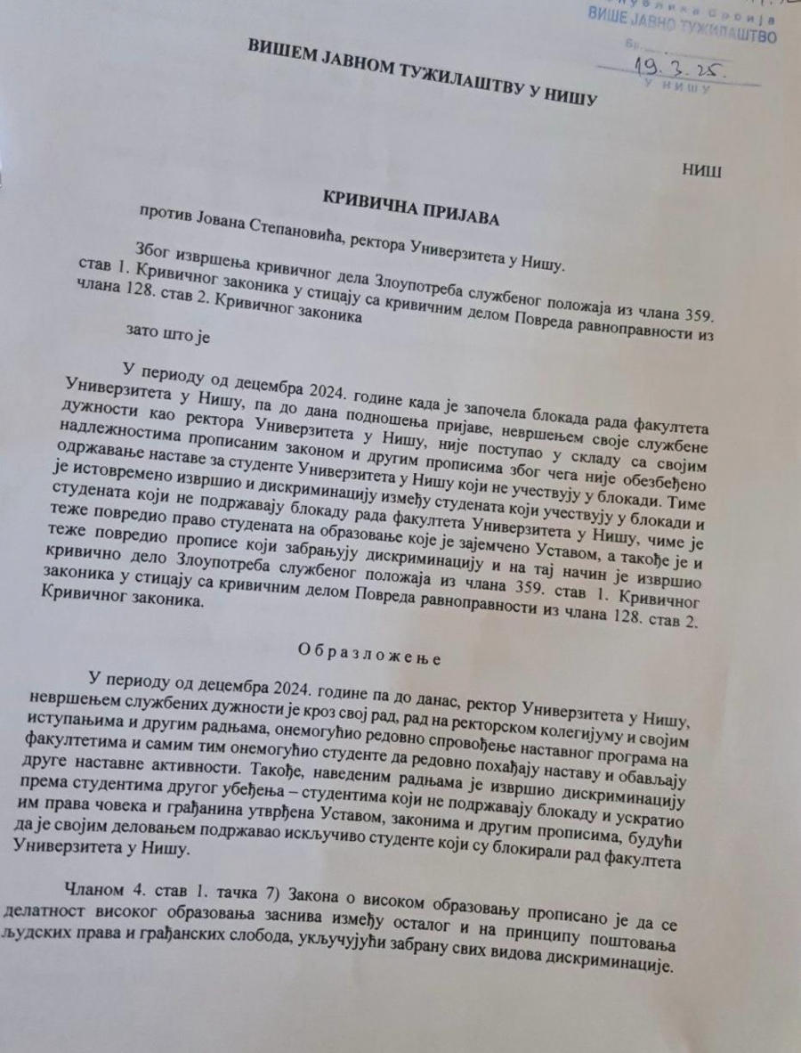 Kako je u obraćanju medijima objasnio predstavnik studenata koji žele da uče, Miloš Pavlović, prijava je podneta "zbog zloupotrebe službenog položaja, jer je od decembra 2024. godine od kad je počela blokada, nevršenjem svoje službene dužnosti kao rektor Univerziteta u Nišu, nije postupao u skladu sa svojim nadležnostima, zbog čega nije obezbeđeno održavanje nastave za studente koji ne učestvuju u blokadi. Time je izvršio diskriminaciju između studenata koji učestvuju u blokadi i studenata koji ne podržavaj blokadu fakulteta, čime im je povredio pravo na obrazovanje koje je zajamčeno ustavom."