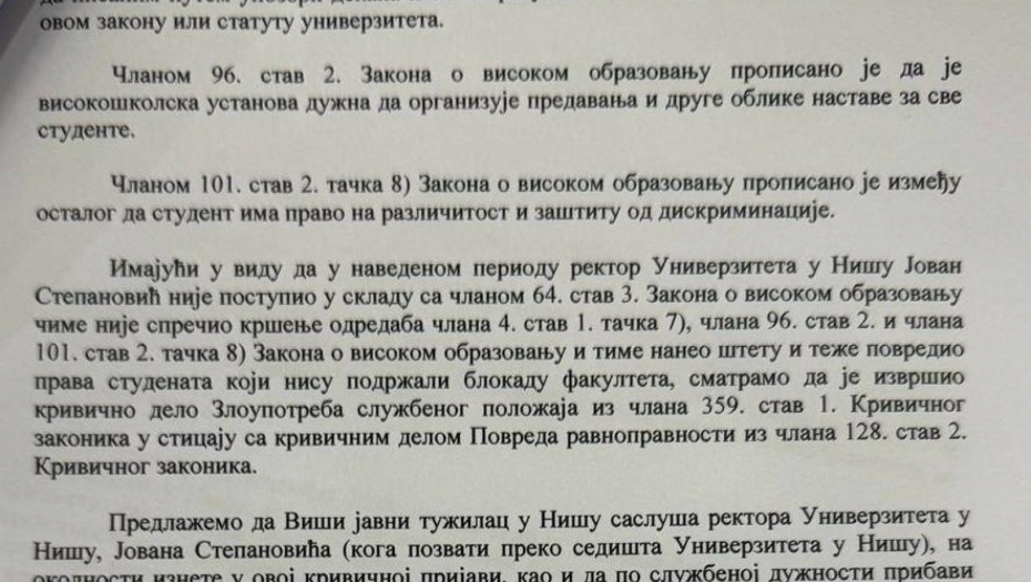Kako stoji u krivičnoj prijavi, navodi se da je su prekršeni Član 64. stav 3, Član 96. stav 2, i Član 101. stav 2 Zakona o visokom obrazovanju.