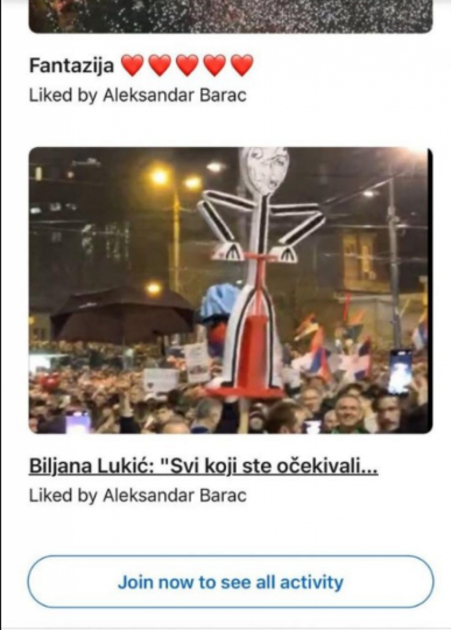 Barać je, kako se može videti na printskrinovima, redovno lajkovao objave osvedočene hejterke Biljane Lukić.