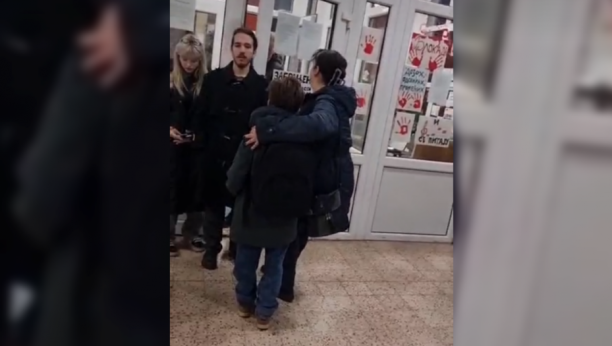 Kako se vidi na snimku koji je nastao u jednoj školi u Kragujevcu, blokaderi su strali na ulaz u školu i nisu hteli da puste profesorku sa detetom da prođe.