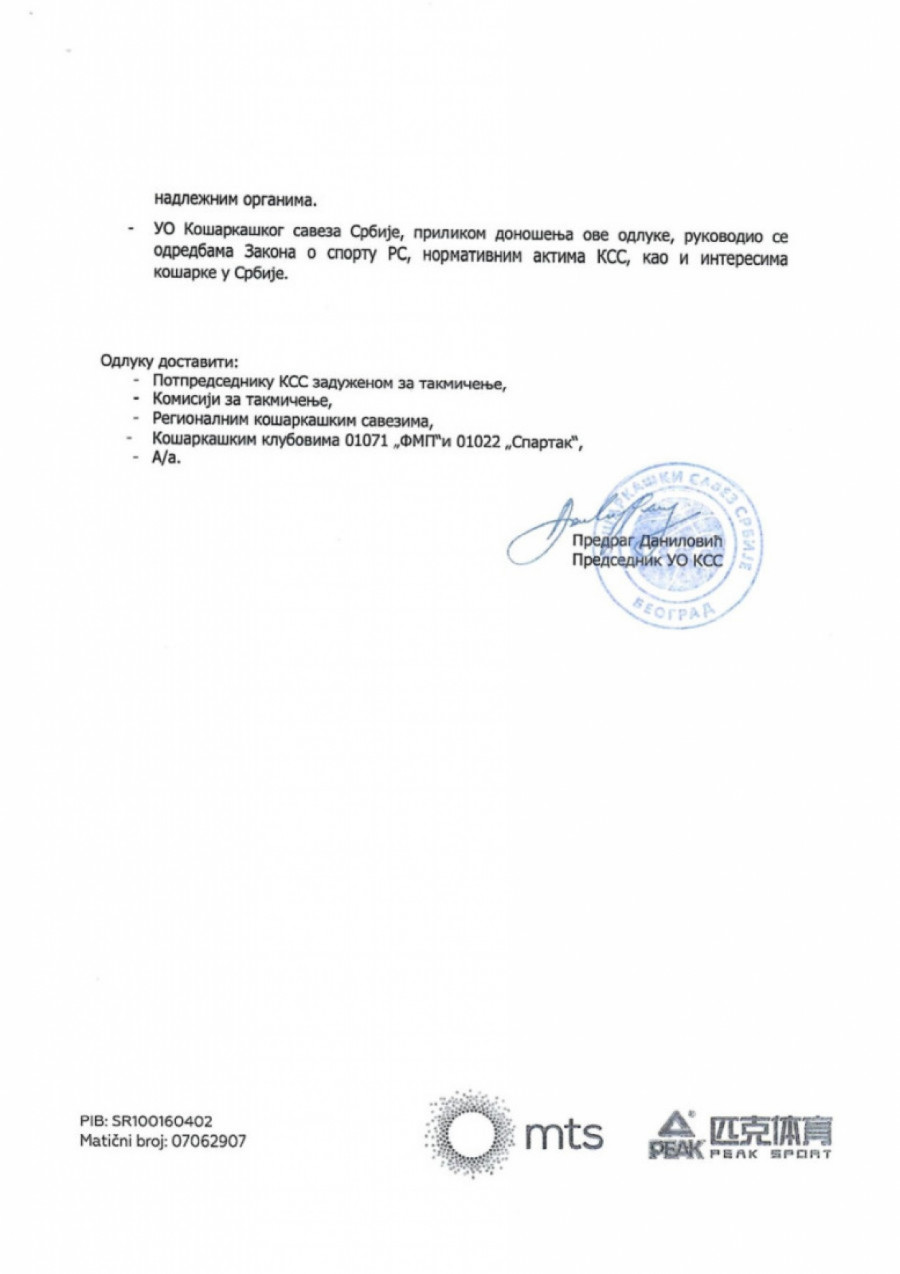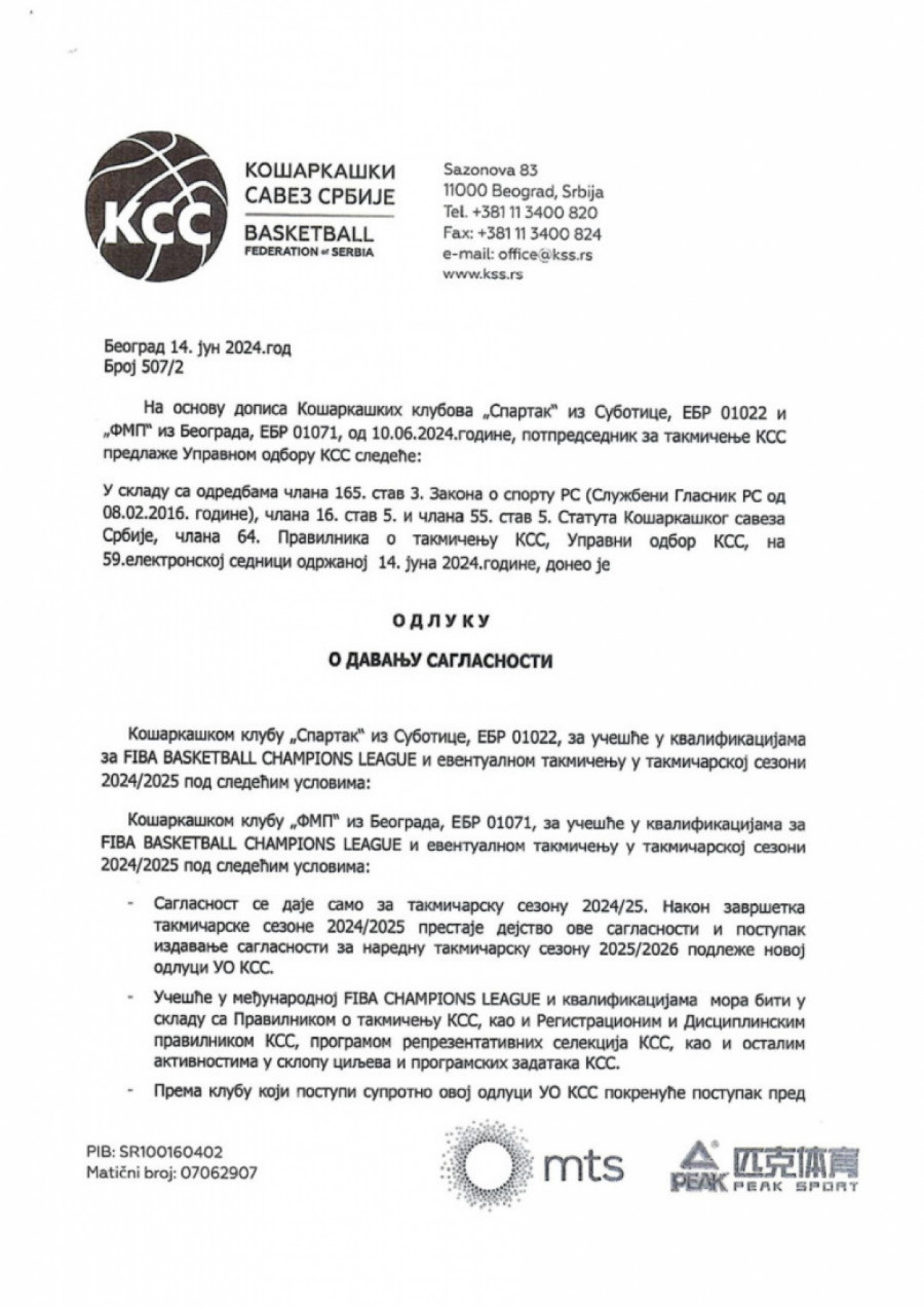 - Upravni odbor KSS u prethodnom sazivu nikada nije doneo nikakvu odluku o uplati novca KK FMP iz Železnika. U skladu sa Zakonom i Pravilnikom KSS KK FMP i KK Spartak 14. juna 2024. godine data je saglasnost za učešće u FIBA Basketball Champions League za sezonu 2024/25 i to je jedina odluka koju je UO KSS doneo. Nikakvih odluka o donaciji nije bilo, jer bi realizacija tih sredstava morala da ide uz prateću dokumentaciju.