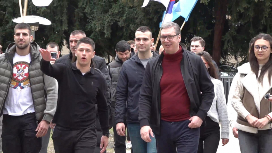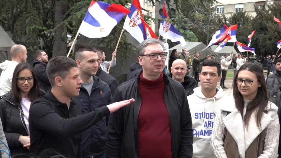 Studenti čiji je glavni zahtev početak nastave srdačno su dočekali predsednika Vučića uz zastave Republike Srbije.