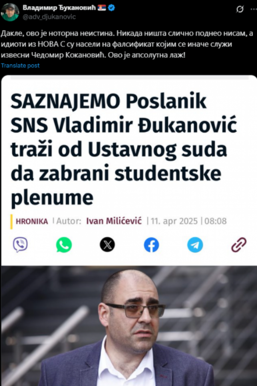 Inače, Šolakovo glasilo Nova jutros je objavilo vest da advokat Vladimir Đukanović od ustavnog suda traži da zabrani studentske plenume.