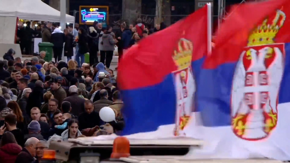 Vesela atmosfera prvog dana svesrpskog sabora u Beogradu. Poneta je najduža zastava Srbije u istoriji, stigli su Srbi sa Kosmeta i iz Novog Sada, predsednik Vučić se obratio javnosti, a predsednik SNS Miloš Vučević uručio je zahvalnice studentima koji žele da uče.