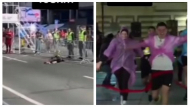Naime, na snimku se nalazi Kenijac koji je nakon pretrčanih 42 kilometara na Beogradskom maratonu, pao i jedva došao k sebi, a s druge strane vidimo blokadere koji posle navodno pretrčanih 105 kilometara ulaze srećni i veseli i nastavljaju da igraju i smeju se, e pa deco - teško...