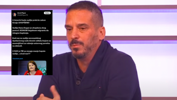"U Americi kada sudije prekrše zakon bivaju uhapšene! Sudija Hana Dugan je uhapšena zbog pomoći jednom ilegalnom migrantu da izbegne hapšenje. Kod nas su sudije novosadskog Apelacionog suda donele odluku kojom su osumnjičeni za rušenje ustavnog poretka na slobodi", napisao je Uroš Piper.