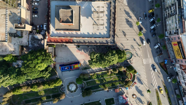 Iako je trebalo da počne u 18 časova, snimak iz vazduha pokazuje da se saobraćaj u centru Jagodine odvija normalno.
