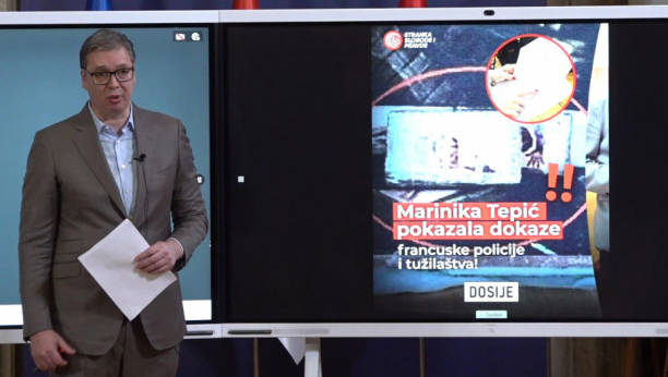 "Ovde je paket droge sa mojim likom, kako tvrdi Marinika Tepić", rekao je Vučić, a onda pokazao deo konferencije Marinike Tepić na kome je to govorila.