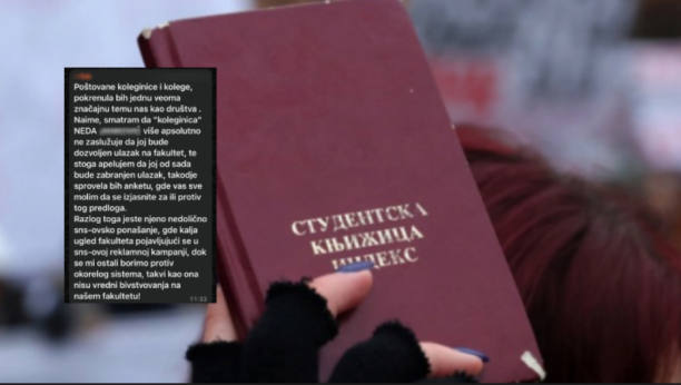 - Poštovane koleginice i kolege, pokrenula bih jednu veoma značajnu temu nas kao društva. Naime, smatram da "koleginica" Neda više apsolutno ne zaslužuje da joj bude dozvoljen ulazak na fakultet, te stoga apelujem da joj od sada bude zabranjen ulazak, takođe sprovela bih anketu, gde vas sve molim da se izjasnite za ili protiv tog predloga - navodi se u pozivu blokadera.
