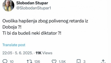 - Ovolika hapšenja zbog polivenog retarda iz Doboja?! Ti bi da budeš neki diktator - napisao je Stupar.