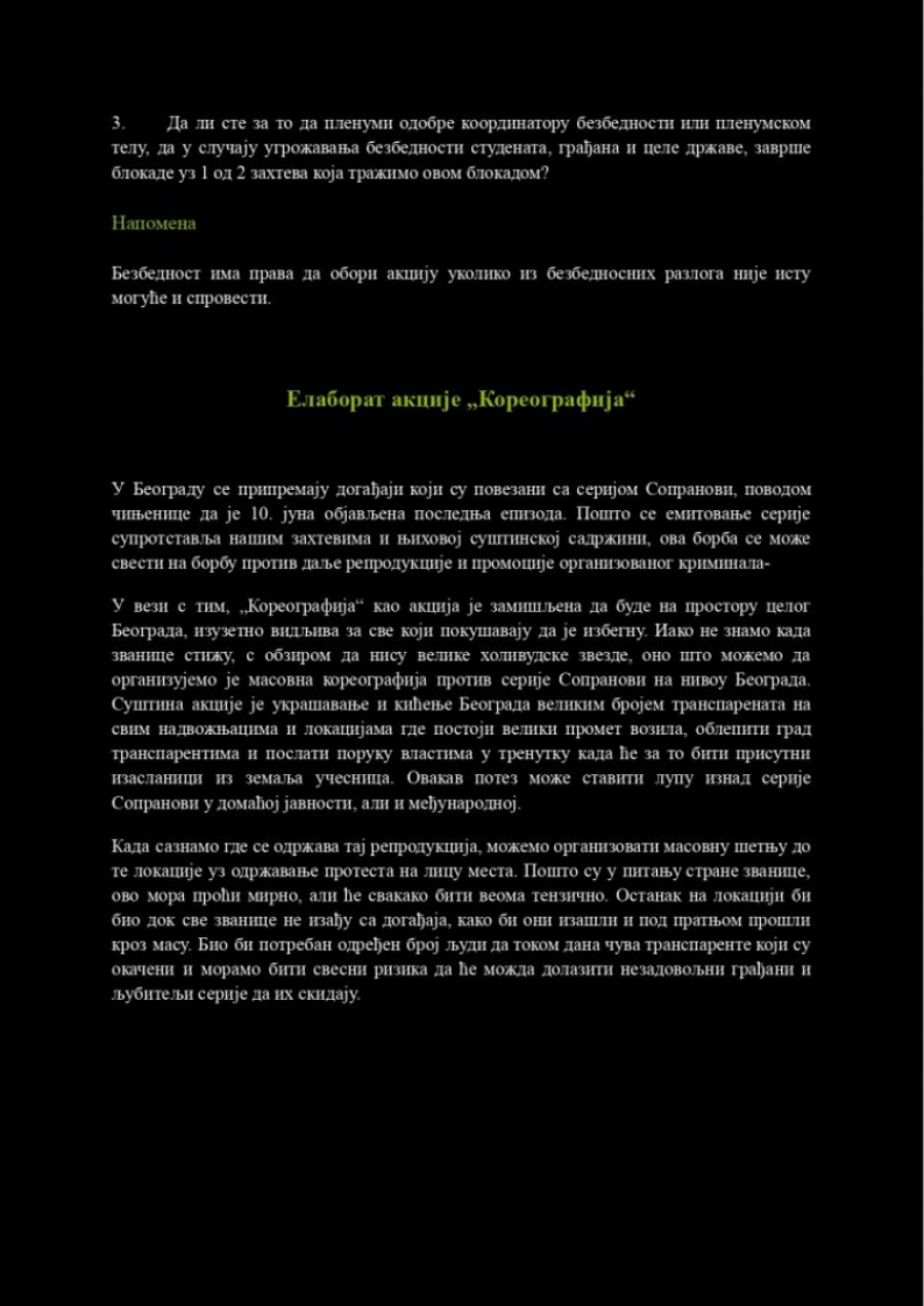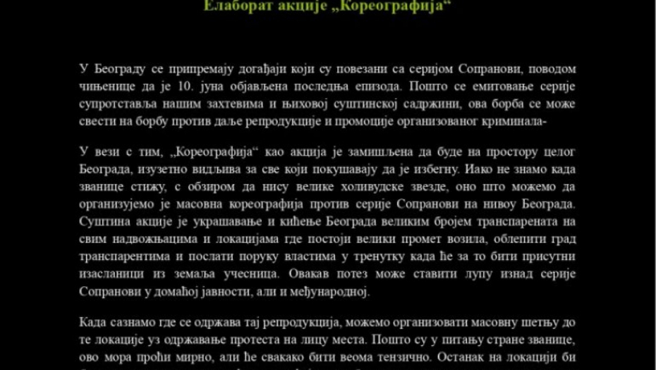 U odvojenom dokumentu pod nazivom „Elaborat akcije Koreografija”, prikazan je plan za vizuelnu sabotažu Beograda – postavljanje transparenata i parola na sve nadvožnjake i prometne lokacije u prestonici. Iako u tekstu govore o borbi protiv serije „Sopranovi”, jasno je da koriste šifrovane poruke za sabotažu EXPO događaja i izazivanje međunarodne sramote.