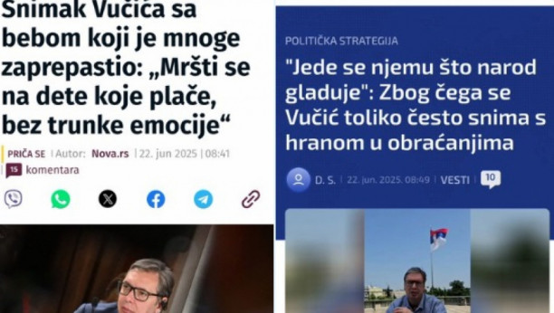 - Do sada je nivo novinarstva N1 i Nova mogao da se definiše kao nizak let, ali sada je to već riljanje po blatu. Davno su se oprostili od bilo kakvih profesionalnih i etičkih standarda, ali njihova frustriranost Aleksandrom Vučićem je sada već stvar ozbiljne patologije. Nije im prošlo da je lopov, izdajnik, nepomenik, nečastivi, zlo i slično, pa su se neki genijalci sada setili nove strategije. Čitav dan oni ljudi skupljaju nebuloze tipa da se mršti na bebe i da se bahati uz ćevape i burek! I onda to neko i objavi! Da postoji pumpadžijski Pulicer, taj bi na pola podelili za ovakve uratke! Samo napred, predsedniče