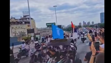 Nepreglednu kolonu pozdravlja okupljeni narod, dok se čuju sirene, viore trobojke i visoko dižu TRI prsta!