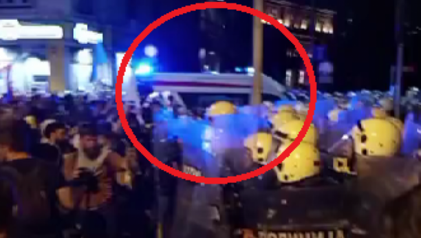 Kako se može videti na snimku, vozilo Hitne pomoći, sa upaljenom rotacijom i sirenom, ostaje blokirano usred ulice zbog grupe demonstranata!