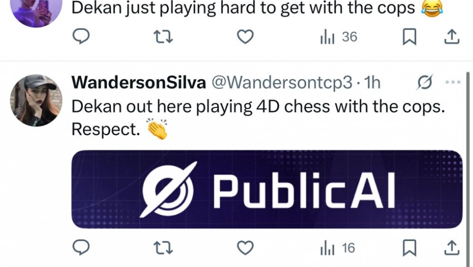 Ispod mnogih stoji oznaka "Public AI", što ukazuje da je reč o generisanim porukama, a ne komentarima stvarnih ljudi.