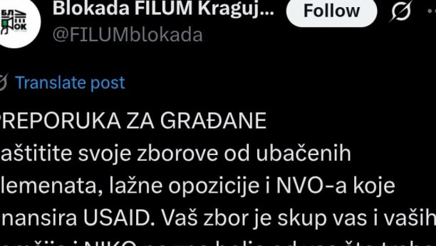 Drugim rečima, blokaderi iz Kragujevca otvoreno napadaju svoje saborce iz drugih gradova, nevladine organizacije i opozicione stranke – za koje tvrde da ih finansira američki USAID, koji je inače i zatvoren.
